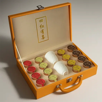 Перед вами утонченный набор для ценителей, в который входят: 4 банки Да Хун Пао, 4 банки Жоу Гуй, 4 банки Джи Джу Мэй и 4 банки Лапсанг Сушонг, всего 16 банок по 8 г. Каждый чай раскрывает богатство вкуса в каждой заварке, а две изящные керамические чаши